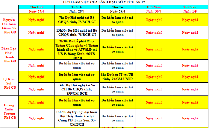 Lịch công tác của Lãnh đạo Sở