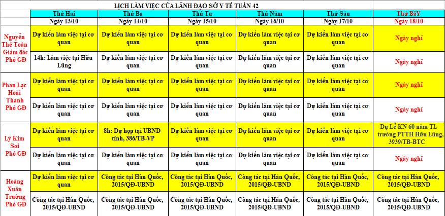 Lịch làm việc tuần của Lãnh đạo Sở Y tế