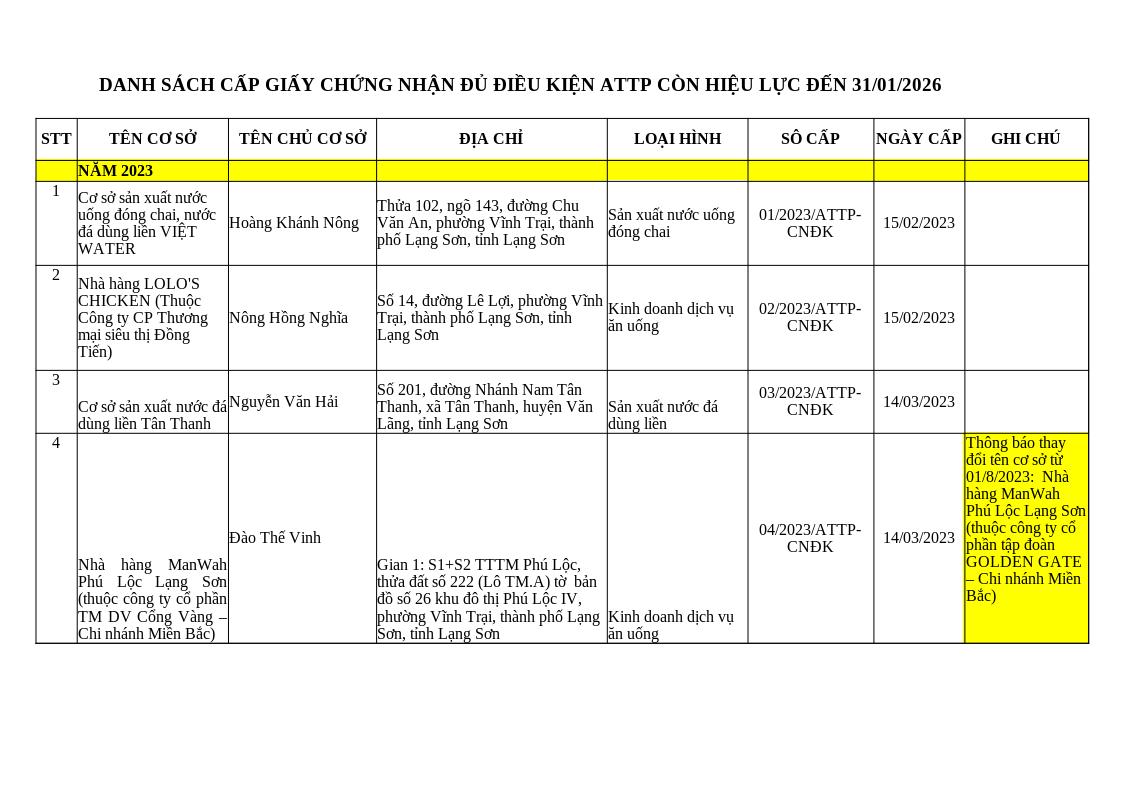 | Tiêu đề văn bản | Danh sách cơ sở đủ điều kiện an toàn thực phẩm còn hiệu lực đến 31/01/2026 | ||