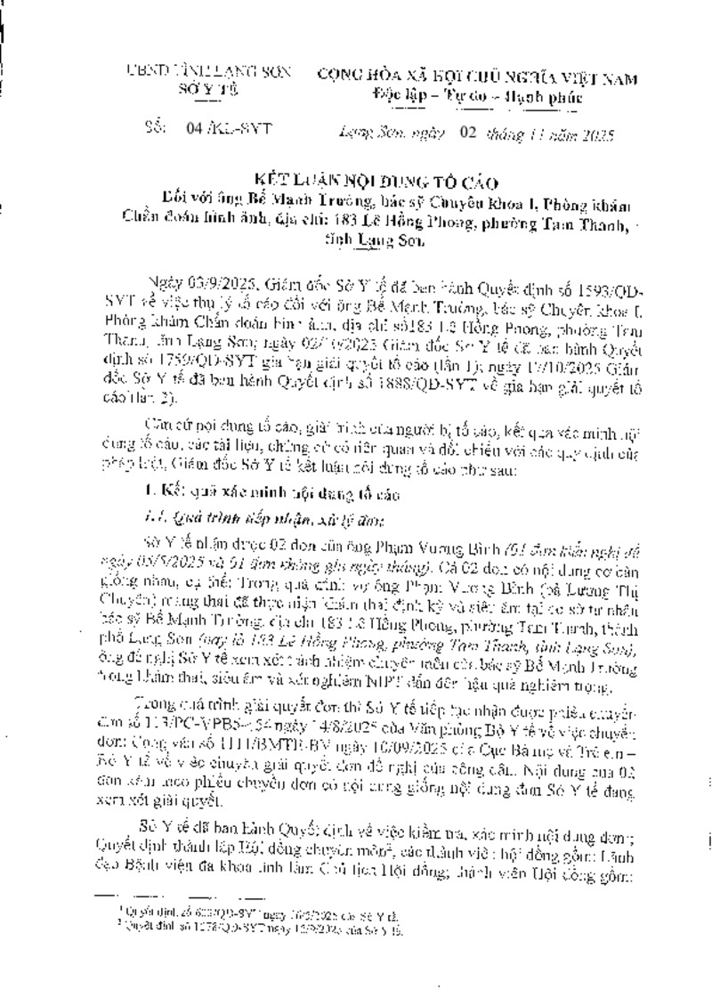 | Tiêu đề văn bản | Thông báo kết luận nội dung tố cáo Đối với ông Bế Mạnh Trường, bác sỹ Chuyên khoa I, Phòng khám Siêu âm chẩn đoán hình ảnh, địa chỉ: 183 Lê Hồng Phong, phường Tam Thanh, tỉnh Lạng Sơn | ||