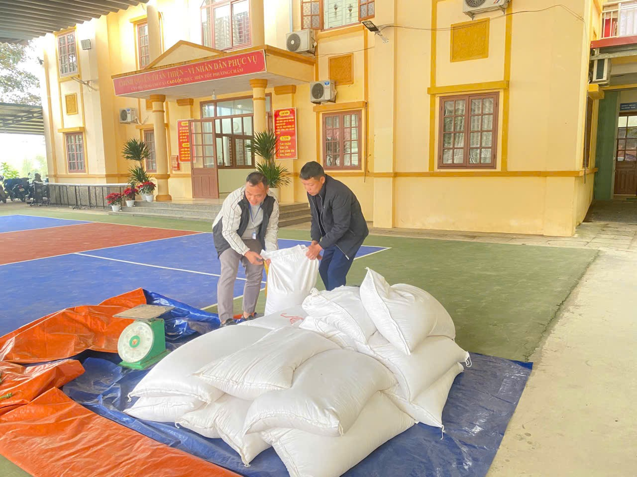 Cán bộ văn hóa- xã hội xã Cao Lộc cấp phát gạo cho người dân