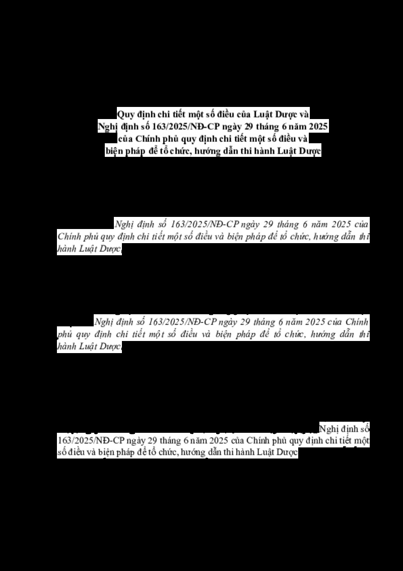 | Tiêu đề văn bản | Thông tư Quy định chi tiết một số điều của Luật Dược và Nghị định số 163/2025/NĐ-CP ngày 29 tháng 6 năm 2025 của Chính phủ quy định chi tiết một số điều và biện pháp để tổ chức, hướng dẫn thi hành Luật Dược | ||