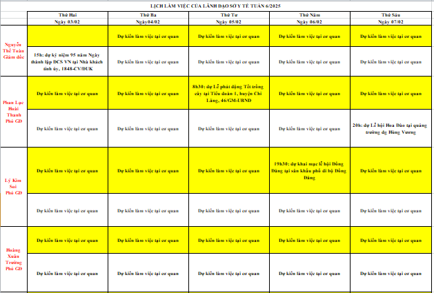 Lịch làm việc của Lãnh đạo Sở