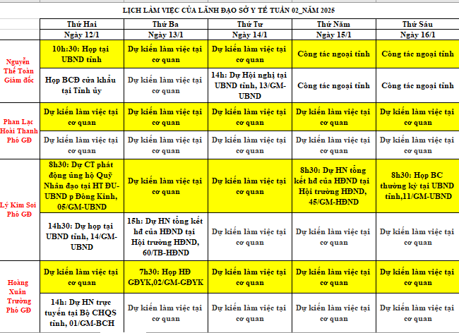 Lịch làm việc tuần của Lãnh đạo Sở Y tế