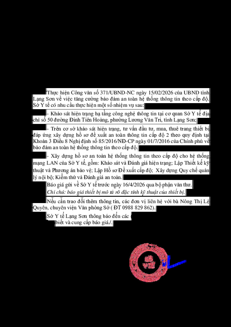 | Tiêu đề văn bản | đề nghị báo giá danh mục thiết bị và xây dựng Hồ sơ cấp độ 2 cho hệ thống mạng tại Sở Y tế tỉnh Lạng Sơn | ||