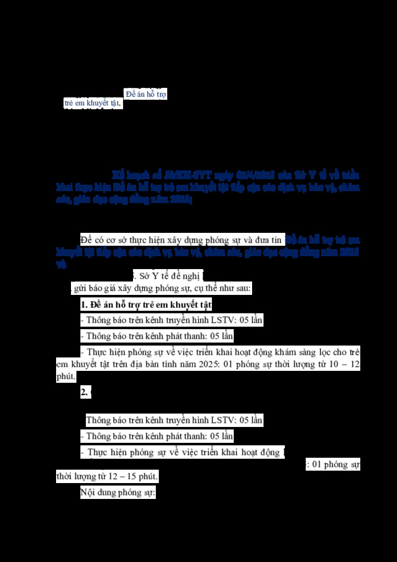 Tiêu đề văn bản | đề nghị báo giá xây dựng phóng sự và đưa tin Đề án hỗ trợ trẻ em khuyết tật, Chương trình khám, hội chẩn tim mạch miễn phí cho Trẻ em trên địa bàn tỉnh Lạng Sơn năm 2025 | ||