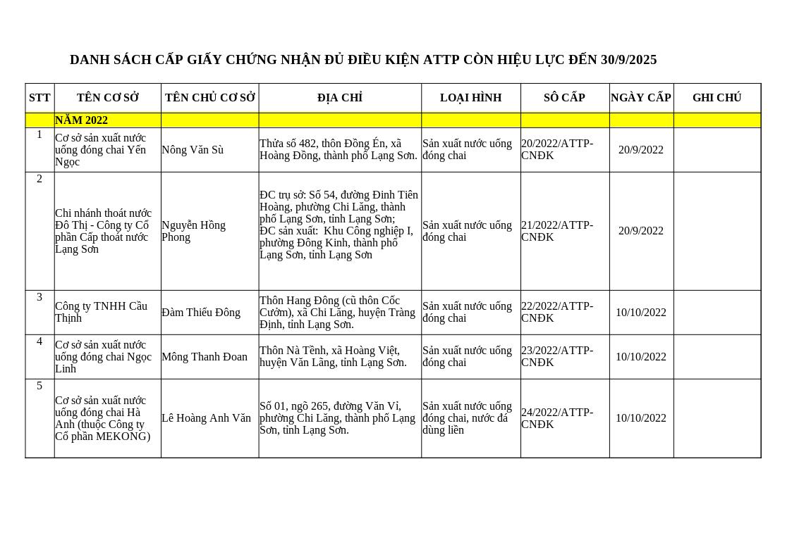 Tiêu đề văn bản | Danh sách cấp giấy chứng nhận cơ sở đủ điều kiện an toàn thực phẩm còn hiều lực đến 30/9/2025. | ||
