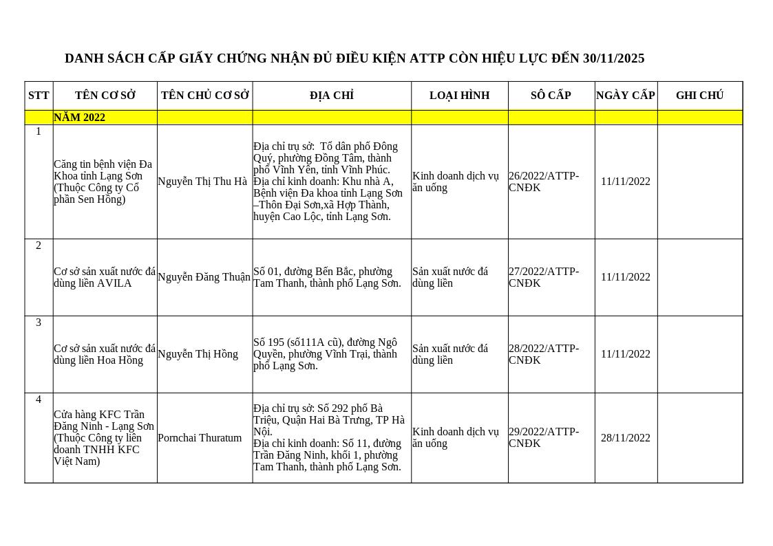| Tiêu đề văn bản | Danh sách cơ sở đủ điều kiện an toàn thực phẩm còn hiệu lực đến 30/11/2025 | ||