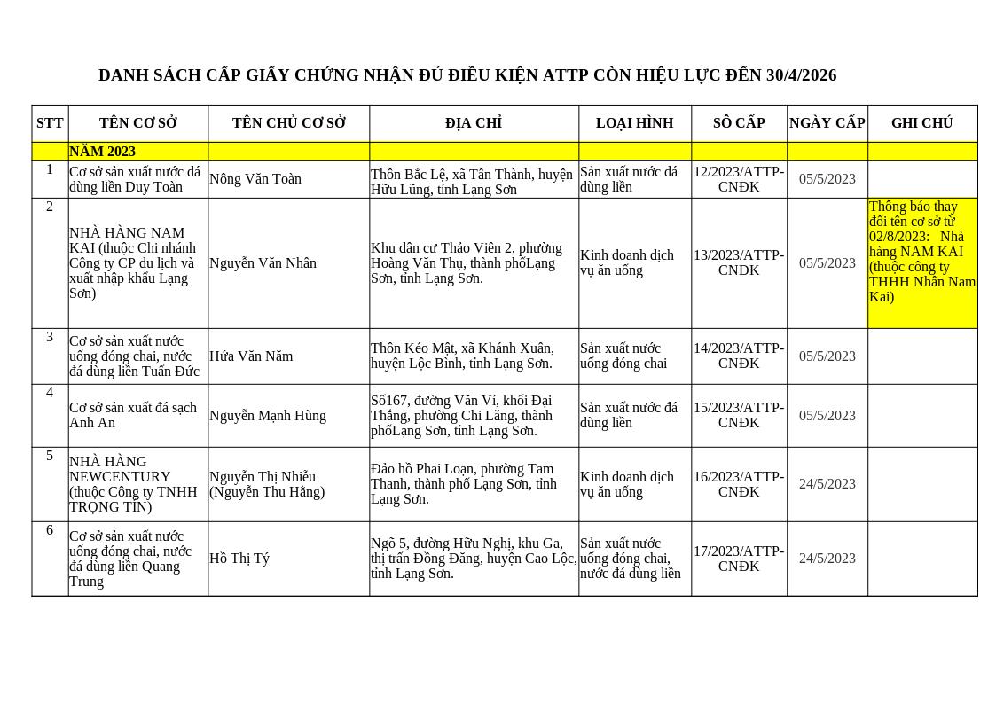 | Tiêu đề văn bản | Danh sách cơ sở đủ điều kiện an toàn thực phẩm còn hiệu lực đến 30/4/2026 | ||