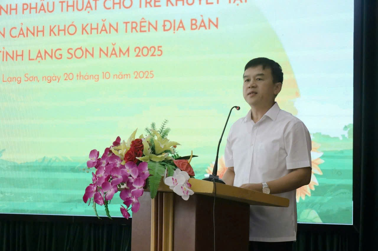 Sáng ngày 20/10/2025, tại Bệnh viện Đa khoa tỉnh Lạng Sơn, Sở Y tế đã tổ chức khai mạc Chương trình phẫu thuật cho trẻ khuyết tật có hoàn cảnh khó khăn trên địa bàn tỉnh Lạng Sơn năm 2025. Tham dự khai mạc có đồng chí Phan Lạc Hoài Thanh, Phó Giám đốc Sở Y tế; các đồng chí đại diện lãnh đạo các sở, ban, ngành liên quan cùng đội ngũ chuyên gia, y bác sỹ, một số nhà tài trợ và các trẻ em khuyết tật có hoàn cảnh khó khăn tại các xã, phường trên địa bàn tỉnh.