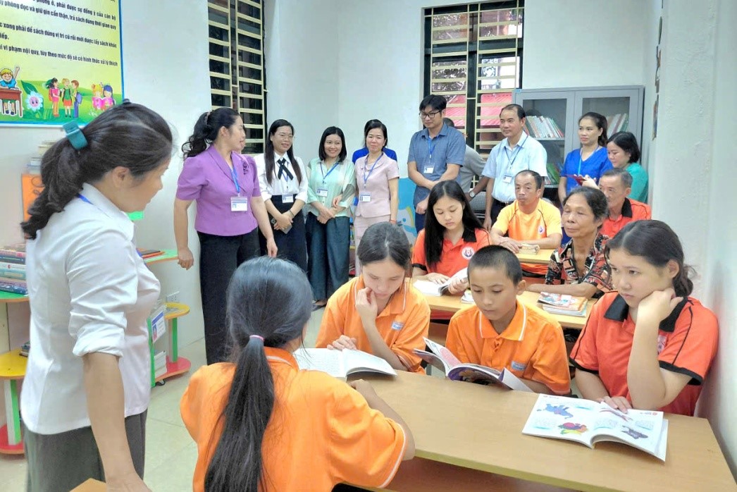 Trẻ em và người cao tuổi tham gia đọc sách trước sự chứng kiến của các đại biểu tham dự buổi bàn giao