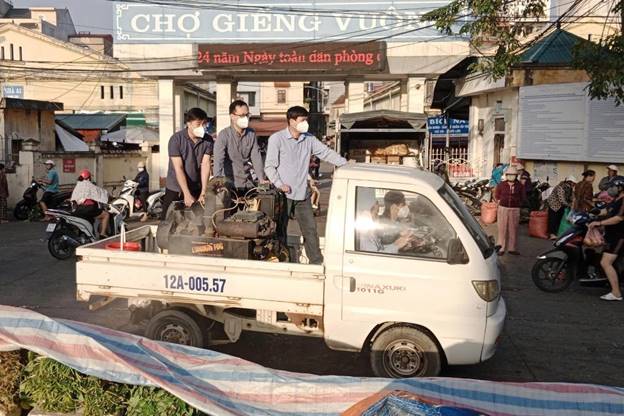 Cán bộ Trung tâm Kiểm soát bệnh tật tỉnh sử dụng xe phun hóa chất diệt muỗi tại cổng chợ Giếng Vuông